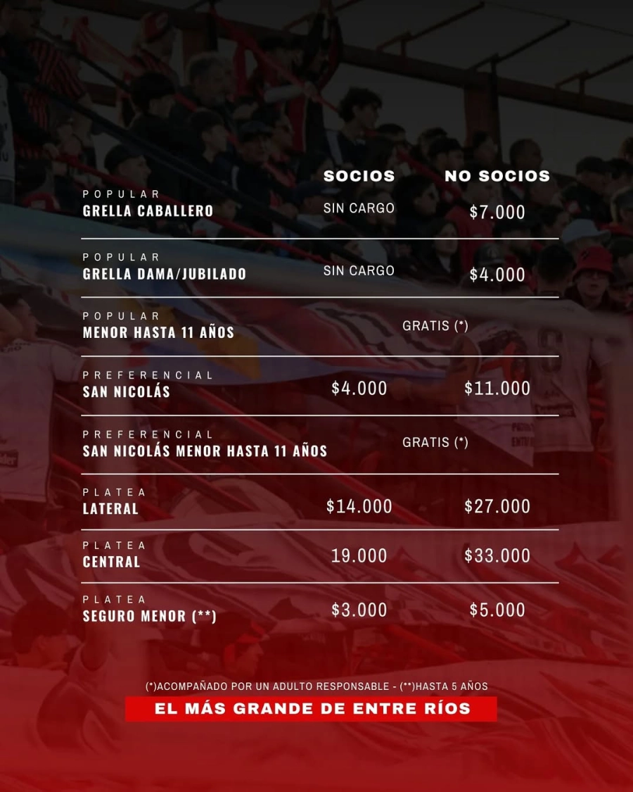 - Menores de hasta 11 años ingresan gratis, tanto en la popular como en la platea San Nicolás.