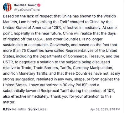 En un nuevo capítulo de su volátil política comercial, el presidente de Estados Unidos, Donald Trump, anunció una pausa de 90 días en el aumento de aranceles para la mayoría de los países, incluida la Argentina, pero confirmó una suba inmediata al 125% para las importaciones chinas, endureciendo así su ofensiva contra Pekín.