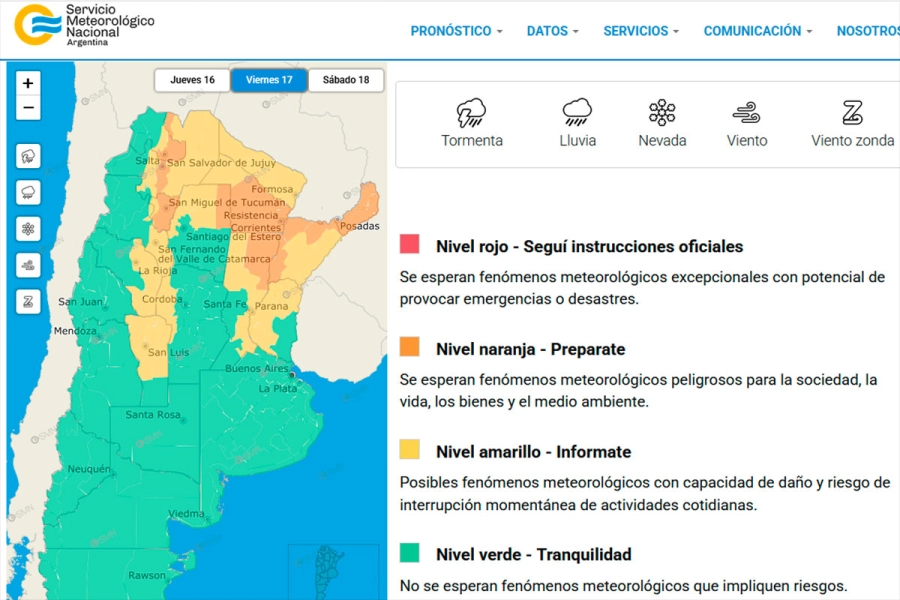 Además de Entre Ríos, las alertas meteorológicas alcanzan a Santa Fe, Corrientes, Misiones, Chaco, Formosa, Santiago del Estero, Tucumán, Salta, Jujuy, Catamarca, La Rioja, San Luis y Córdoba.